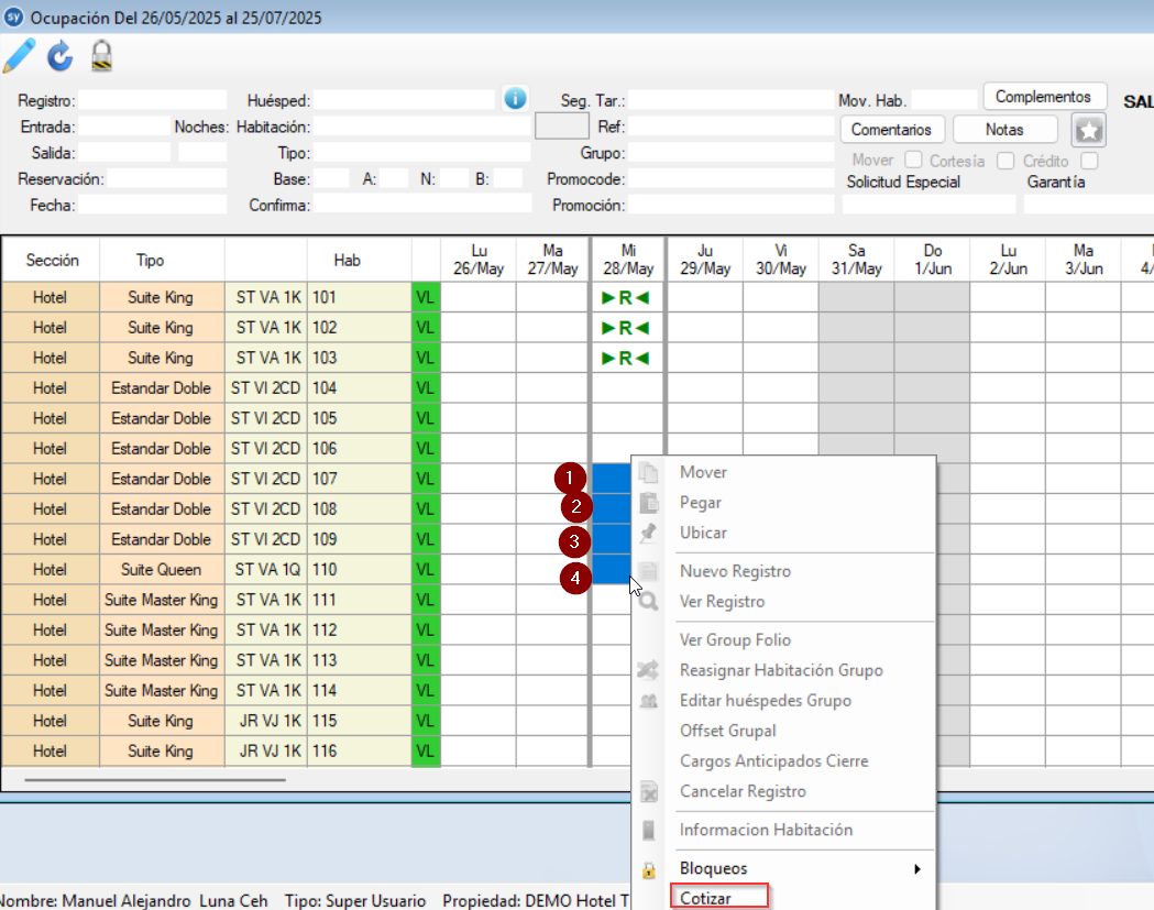 Para poder crear un grupo de esta manera es necesario seleccionar las habitaciones a asignar desde la sabana del sistema, acto seguido se presiona un click derecho para desplegar el menú de operaciones y se debe seleccionar la opción COTIZAR.