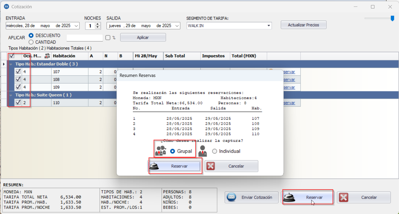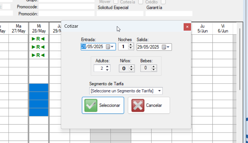 Al seleccionar esta opción nos pedirá que escojamos las fechas de estancia de la cotización, número de personas por habitación y un segmento de tarifa que será el encargado de asignar los precios por noche, una vez seleccionadas las opciones presionamos el botón seleccionar para que se nos despliegue la pestaña de la cotización desde donde podremos generar nuestra reservación grupal seleccionando las habitaciones cotizadas.