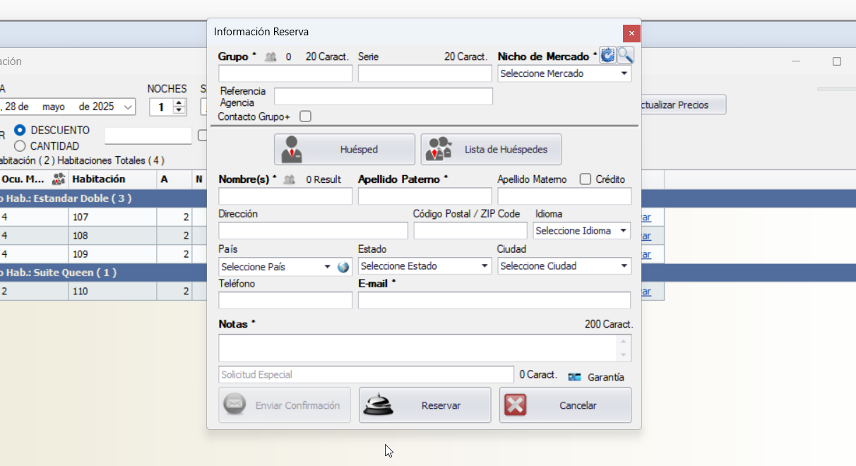 Una vez capturados los campos obligatorios marcado en Texto "negritas" así como los campos opcionales, para lograr guardar el total de reservaciones asignadas en las habitaciones seleccionadas se oprime el botón RESERVAR.